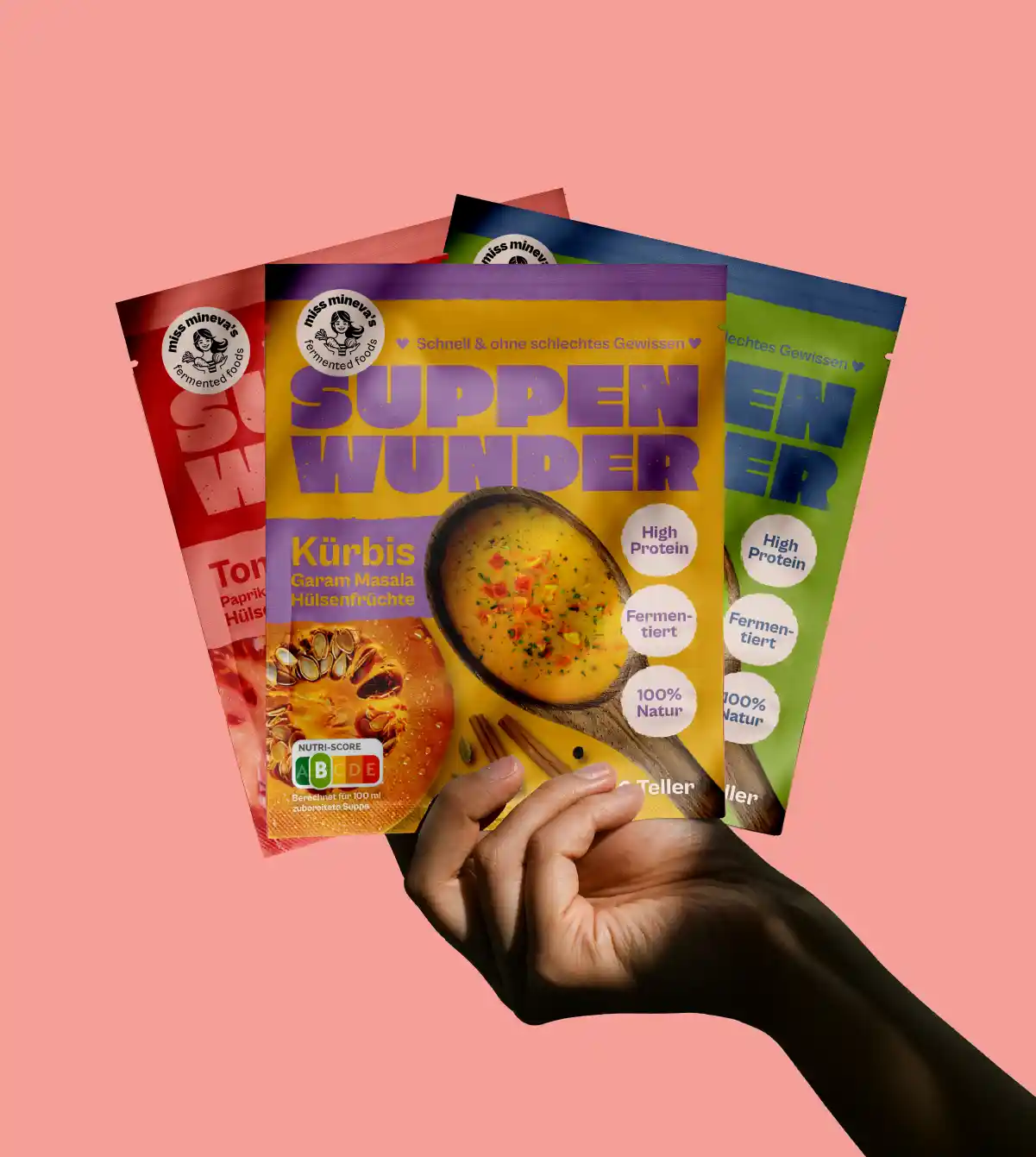 Für Miss Minevas haben wir eine Brand kreiert, die im Supermarktregal neben den Big Playern auffällt und mit Freude in den Einkaufswagen wandert. Die bunten Brand-Farben supporten den Start-up Charakter und bringen Spaß & Leichtigkeit ins Einkaufserlebnis.